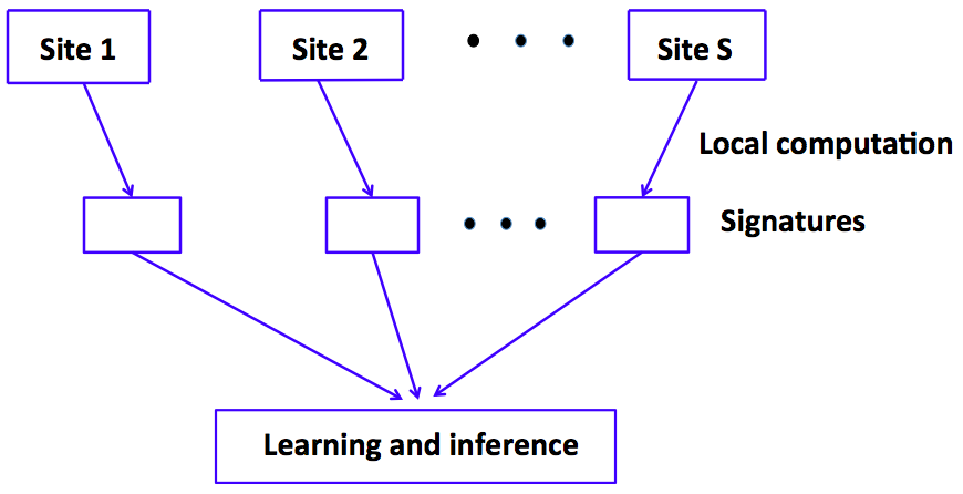 Our framework enables learning and inference over inherently distributed data as if using all the data but with small communication overhead and a negligible loss in accuracy. Under our framework, major computations are performed in parallel locally at where the data is stored. Data privacy may also be preserved. Our framework can be readily applied to a broad class of learning and inference algorithms, including spectral clustering, classification, regression etc.